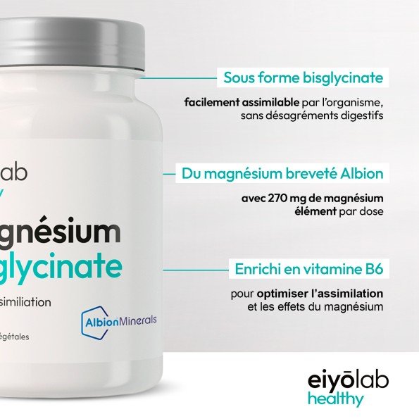 🚀 Hautement dosé, sous forme bisglycinate et enrichi en B6 pour une biodisponibilité maximale, Eiyolab a choisi un magnésium breveté Albion®, gage de qualité premium et de grande pureté.