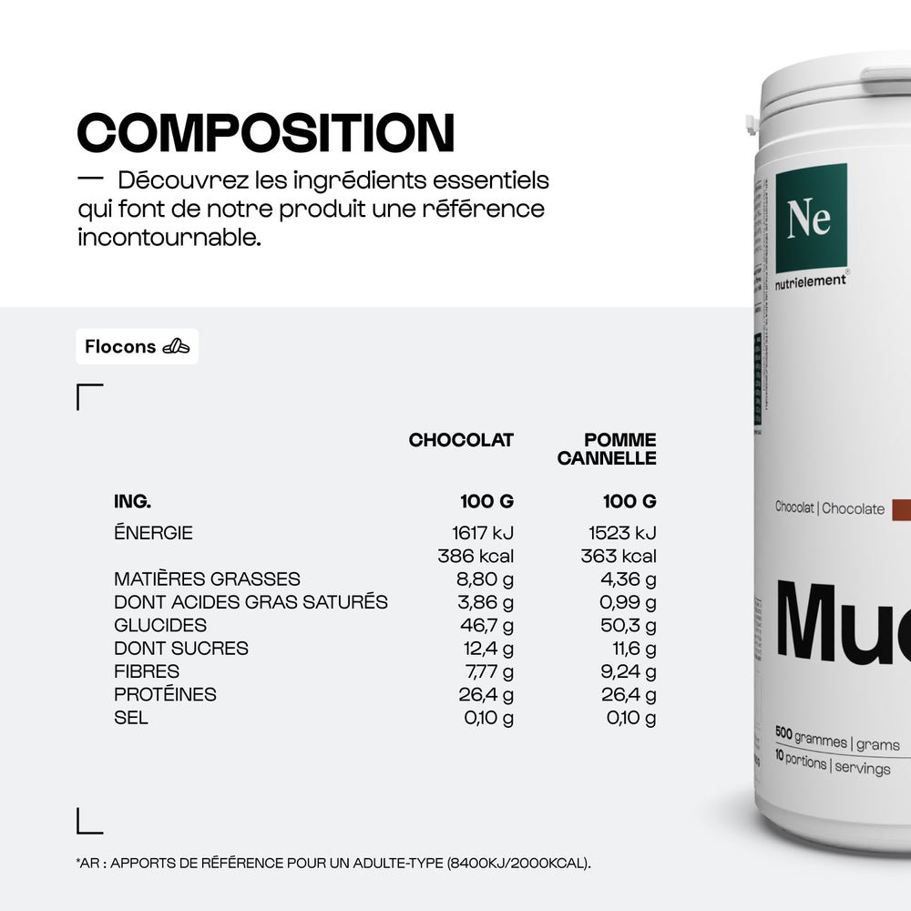 ✔️ Deux saveurs : pépites de chocolat noir ou cubes de pommes séchées bio et cannelle.